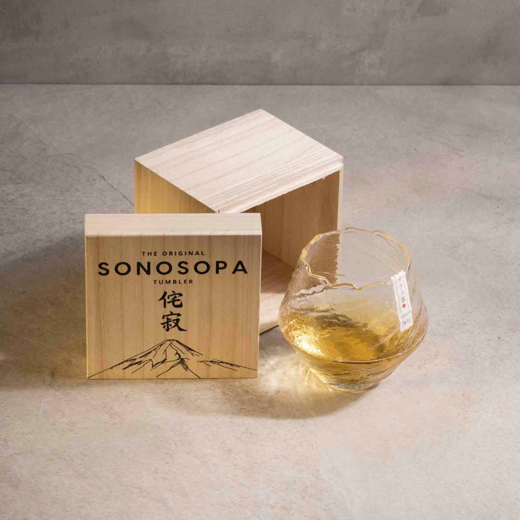 Introducing the Sonosopa Shimo Whiskey Glass. Beautifully crafted from crystal glass and etched by hand to create a high quality, sophisticated piece. This glass is gift wrapped and packaged in a striking Sonosopa original wooden gift box, thoughtfully presented for a great gift or classy storage display.