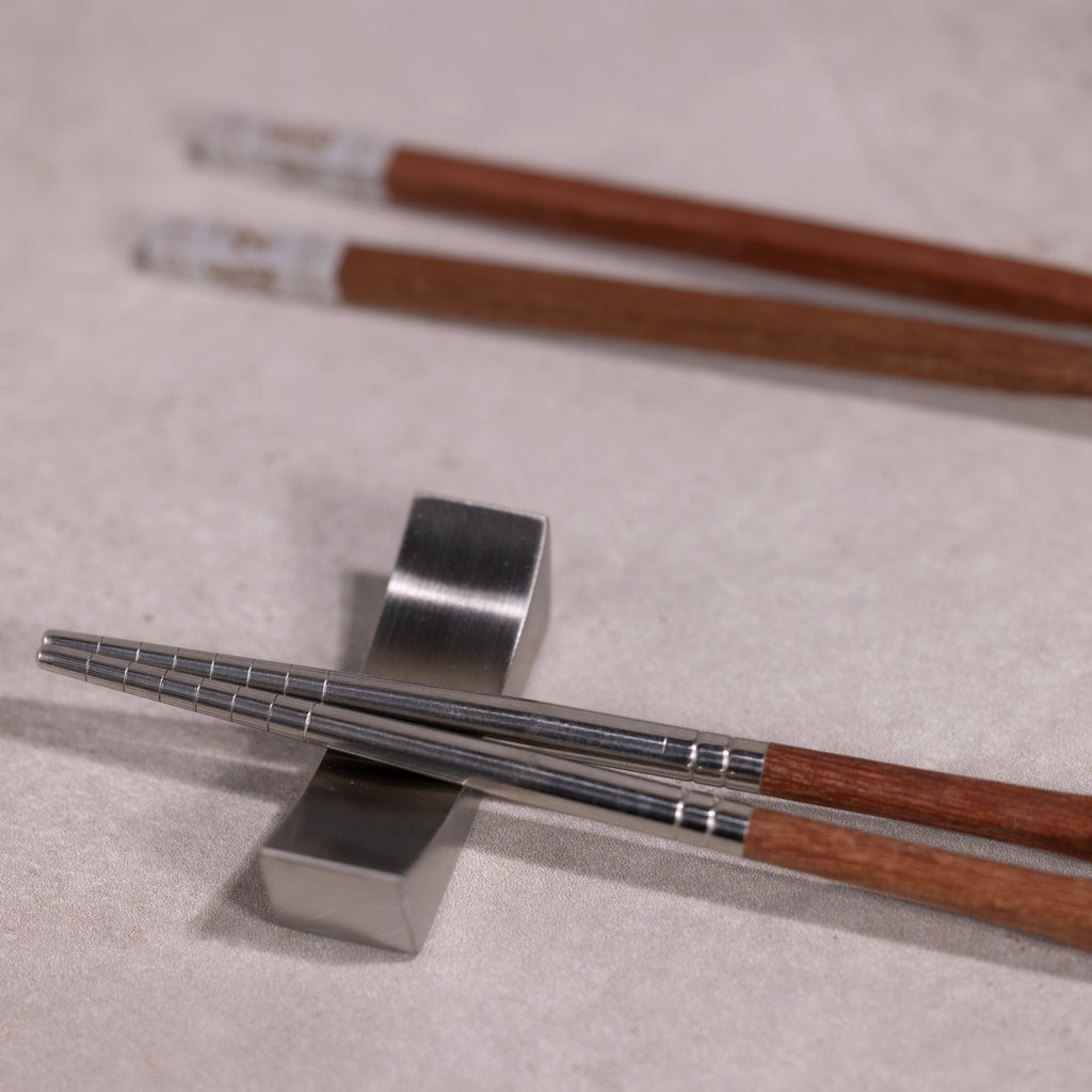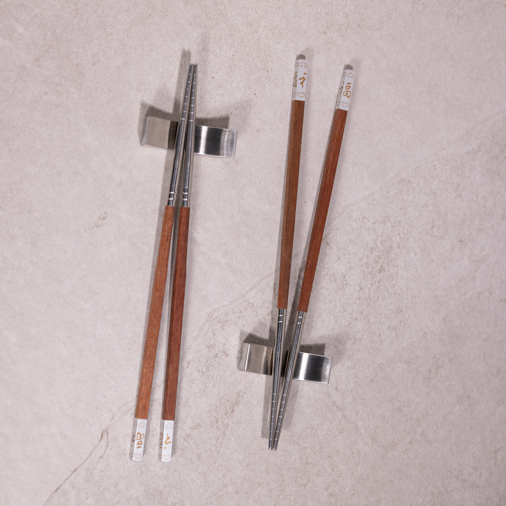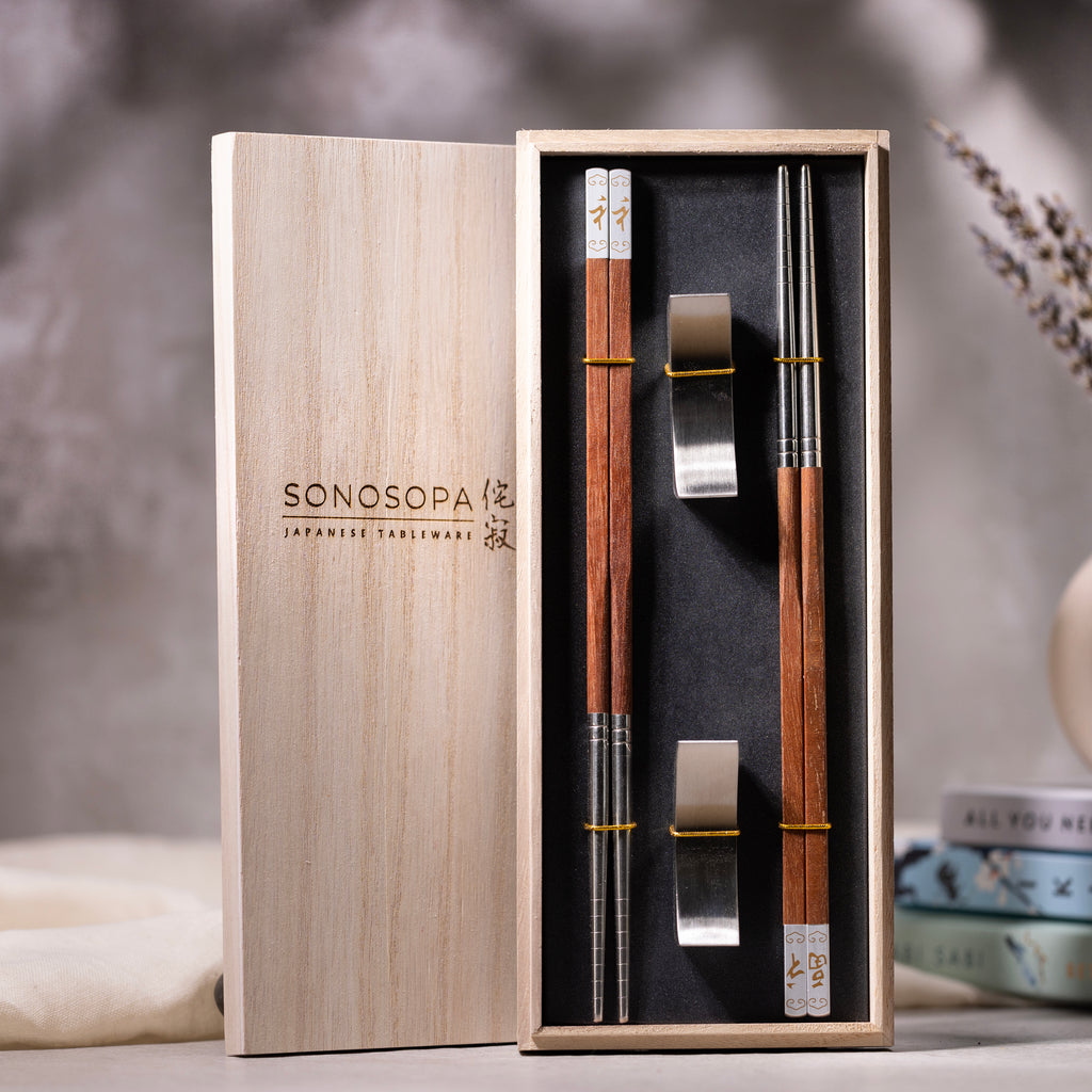 Introducing the Sonosopa Tsuyoi Chopstick Set. Beautifully etched from sandalwood and hand crafted to create a high quality, sophisticated piece. The set is designed for quality long term use, with a lacquered wood finish and stainless steel tips to avoid bacterial build up. This set for two is packaged in a striking handmade wooden gift box with two stainless steel chopstick rests.